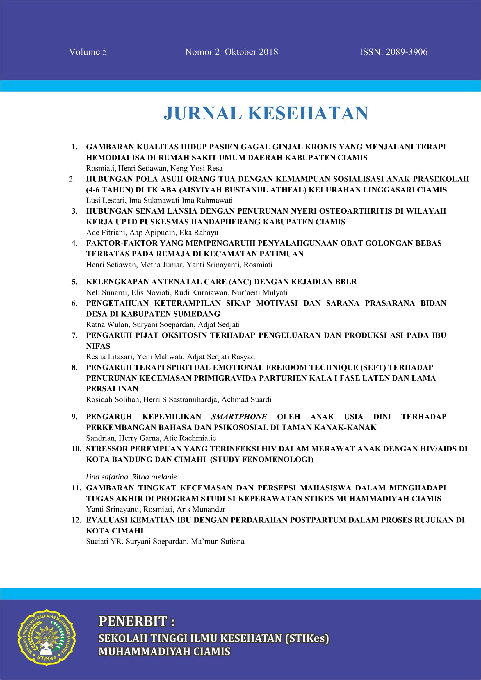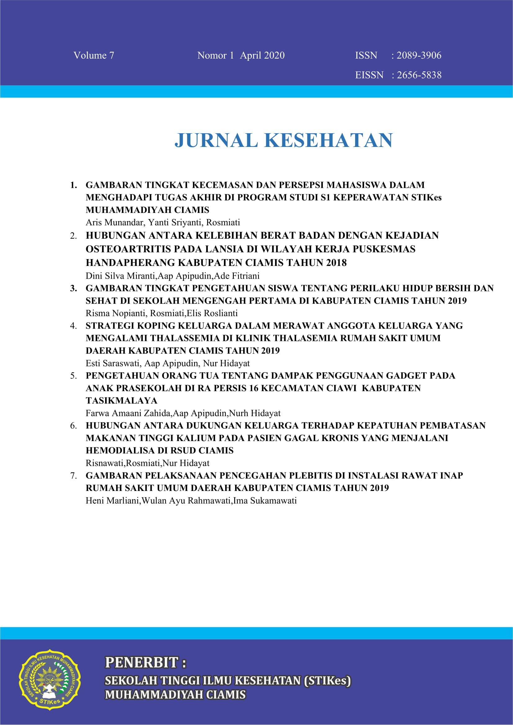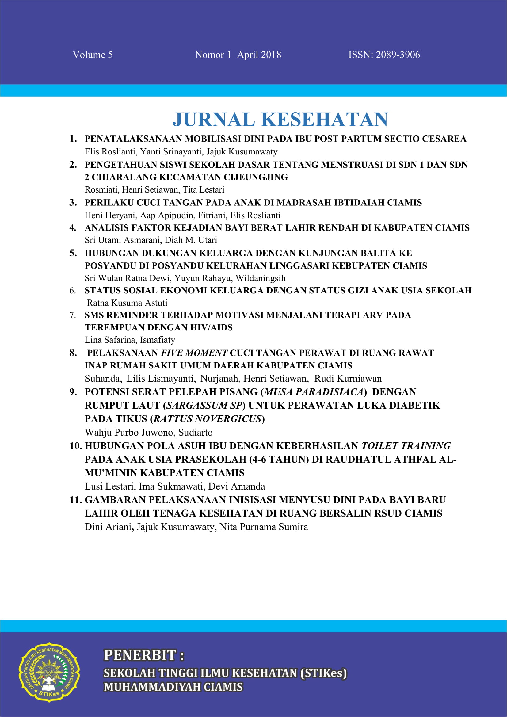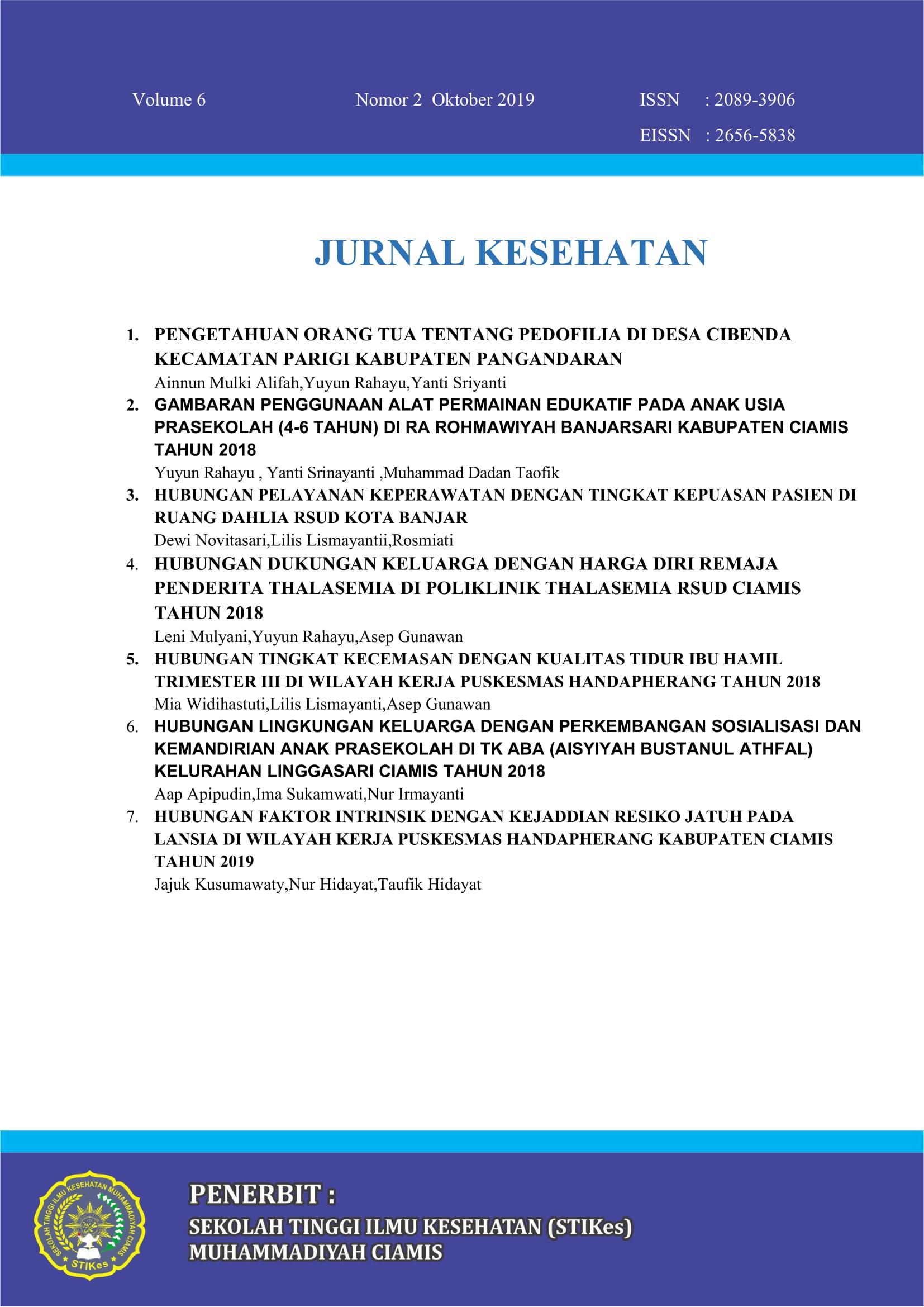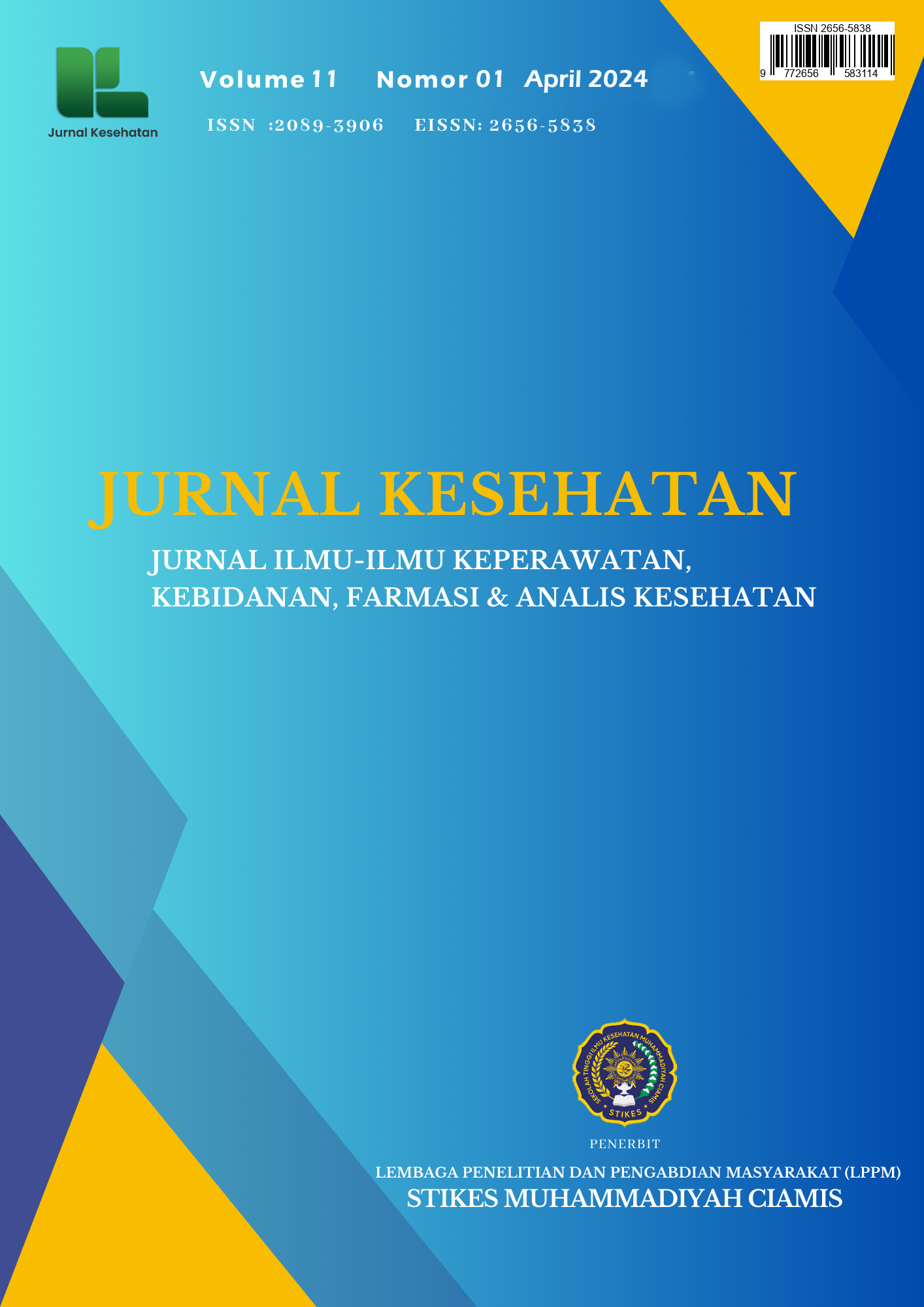 Vol. 9 No. 2 (2022)JURNAL KESEHATAN (JURKES) STIKES MUHAMAMDIYAH CIAMIS diterbitkan oleh : LPPM STIKes Muhamamdiyah Ciamis, sebagai media untuk menyalurkan pemahaman tentang kesehatan di berbagai aspek, jurnal ini berisi tentang artikel dalam bidang keperawatan, kebidanan, farmasi dan analis kesehatan, yang di terbitkan secara berkala 6 bulanan.